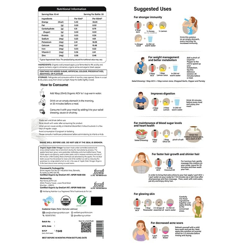 Our USDA Organic ACV with 2x the ‘Mother’ met Amla, Turmeric, Cinnamon, and Black Pepper to create a health booster like no other. These ingredients improve its efficacy by being a rich source of Vitamin C, antioxidants, and enzymes. They minimise the bitterness of the ACV too, to give you the best of nature in a bottle. Acetic acid aids healthy cholesterol and blood pressure, and by balancing your pH levels, our ACV supports glowing skin, healthy hair, treats acne, decreases wrinkles, combats infections and more. Choose the Gold Standard of ACV for best results!