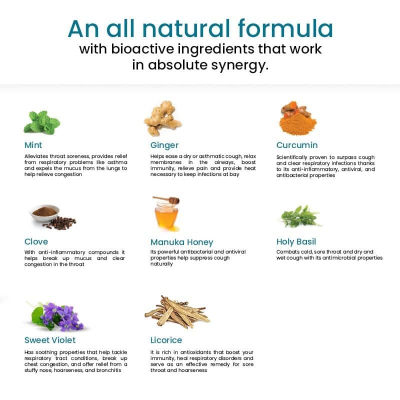 100% Natural, Plant Based ingredients provide quick relief and alleviate the symptoms of cough, congestion and sore throat.
